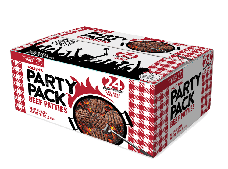 When you’re hosting a party, reunion, or any other gathering, meet your new best friend — Holten’s PARTY PACK™ Beef Patties. Great-tasting, juicy, quarter-pound beef patties will handle any social event you can throw at them. Frozen within 11 minutes of being made and seasoned for grilling, PARTY PACK Beef Patties ARE the party.